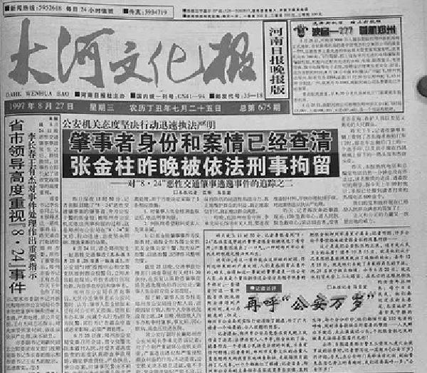 1997年8月24日,Dahe Culture Daily的报告,Zhengzhou Municipal公共安全局ERQI分支的前主任和Zhengzhou High-Tech Zone局的政治委员会与持牌许可人一起驾驶2.0白色轿车,并与SUENONGHAY和SUE DOID一起驾驶,并驾驶了持牌许可证。张金祖(Zhang Jinzhu)在醉酒时开车并朝另一个方向开车。 11岁的Su Lei敲了该地区,他的父亲Su donghai,他的两辆自行车被卡在汽车左侧的前轮胎和后轮胎之间。车祸发生后,被选为公共安全局局长逃脱!这辆车的挡风玻璃被一个大的巢穴击中,但张金祖仍在拖拉苏东(Su donghai)赶紧着头,留下了1,500米的血腥道路。行进,出租车等之后,他们被发现,他们自愿追逐并阻止了皇冠车。武装警察丁·肖恩(Ding Chaozhong),Yan Xin和Li Junling来自Zhengzhou BordeR检验站从机场返回执行任务。看到这一点,他们打电话给导致事故停止的汽车,同时转动汽车的前部并追逐张金祖。追逐近500米后,武装的警车通过了造成事故的汽车,并将汽车挡在了汽车上。许多“面对”和卡车在附近追赶,以阻碍事故。目前,张金祖被迫停止汽车。武装警察丁·查隆(Ding Chaozhong)跳下车,拉开了张金胡(Zhang Jinzhu)的门,把他拉出来,诅咒愤怒:“你是野兽!”和脸上的一巴掌。根据现场的目击者的说法,Su Donghai几乎完全疲倦地退出了,并骨折了许多骨头,左耳的外部血栓掉下来,脚上的白色骨头爆炸了。苏·雷(Su Lei)死于治疗...事件发生的第二天,达赫文化新闻(现为达赫新闻)发表了有关标题的新闻:发生了不良的交通事故昨晚在郑州:一个白色的王冠拖着受伤的人,疯狂地逃跑,出租车司机谨慎行事。从那以后,张金祖迅速被国家媒体促进,并成为公众舆论的热门话题。相关调查使CCTV的“焦点访谈”驾驶员嘲笑。该案的影响从河南迅速传播到整个国家,激发了全国各地的人们的愤怒。张金祖(Zhang Jinzhu)不再是交通跑步者,而是伊利加(Iliga)的常见代表性,公共安全组织的差异和公共安全组织的反派象征。在全国谴责的强烈舆论中,张金胡案案上法庭。当年12月3日,郑州中级人民法院审理了此案。郑州公民急于举报,法院发起了“实时广播”测试过程,大量公民聚集在一起倾听。 1月1日第2卷,1998年,张金胡因交通事故和意外伤害而受到死亡的惩罚。当天下午,达赫每日总编辑的代表隆隆(Ma Yunlong)写了内部参考,认为张金祖的罪行不允许被宽恕”,但“不应惩罚犯罪”,但不应将其发送给Henan High Court和其他省级官员和其他官员,并在14年1月14日在14月14日的官员宣布。 1998年2月16日,河南高等法院维持了第一个判决。事件的真相”。这本书被认为是张金祖的作品案件。在确认了公众舆论强大的力量之后,有一个问题:如果新闻有问题,该怎么办? - 某些人是不合理的。谁开始及时开始讨论“新闻谋杀案”。中国人还需要更多的话语空间。如果您认为新闻是公众舆论,但公众舆论不仅是新闻的一种形式。没有一种公众舆论有权命令法院作出判决,但是当法院判决每个案件时,应考虑公众对其的看法。案件是否是新闻中的热门话题都没关系,应该考虑人们对您的酌处权的看法,因为正义在人民的心中。