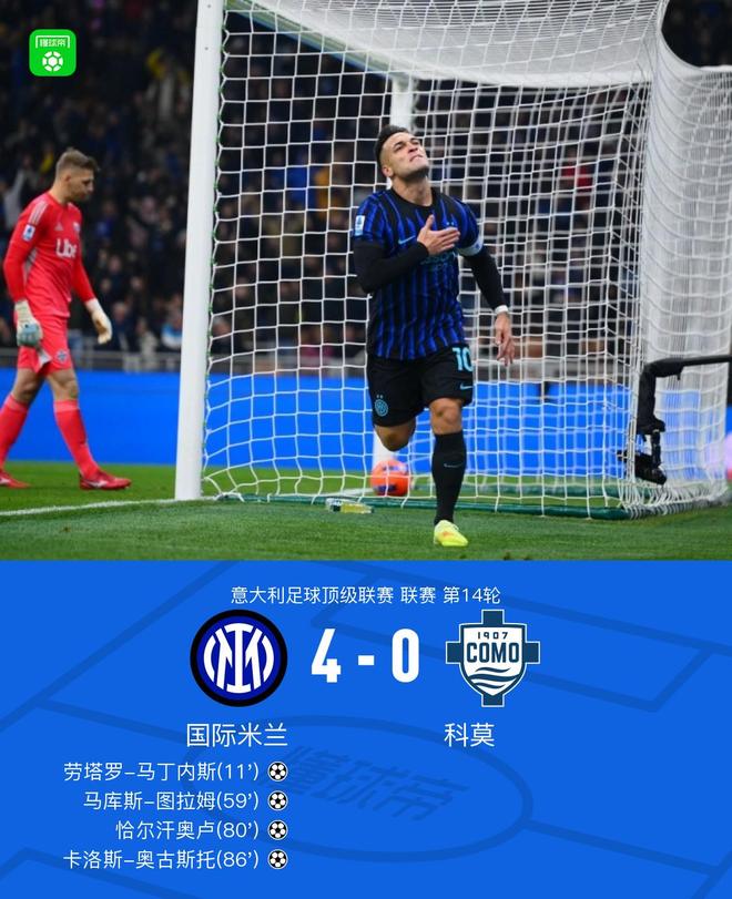 北京时间12月7日,意大利足球甲级联赛第14轮,国际米兰主场迎战科莫。比赛中,路易斯·恩里克助攻,劳塔罗·马丁内斯头球打破僵局。阿切尔比随后精准传球,马库斯图拉姆接球后冷静射门。比赛最后,恰尔汗奥卢依靠个人能力远射得分,进一步扩大领先优势。终场前,迪马科左路传中,卡洛斯·奥古斯托越过他将球推入网内。最终,国米4-0战胜科莫。主赛事第11分钟,恩里克直塞传球。劳塔罗跟进进球。国际米兰1-0科莫。第59分钟,迪马科开出角球,图拉姆破门。国际米兰2-0科莫。第80分钟,锁定胜局。恰尔汗奥卢远射破门。国际米兰3-0科莫。第86分钟,迪马科传球,奥古斯托顶射破门。国际米兰4-0科莫。双方球员在第3分钟就进入比赛。接球后,巴雷拉单刀射门。球被让·布特兹拦截。第11分钟,恩里克直塞传球。劳塔罗跟进进球。国际米兰1-0科莫。第32分钟,莫拉塔受伤,随后无法阻止比赛被换下。第40分钟,遗憾因伤退场,镜头。第45分钟和第2分钟,迭戈·卡洛斯放倒了图拉姆,然后踢倒了劳塔罗。裁判出示了一张黄牌。第52分钟,杜瓦卡斯门前近距离射门。球击得很高。第59分钟,迪马科开出角球,图拉姆破门。国际米兰2-0科莫。第64分钟,迪马科分球偏出,但巴雷拉再次出界。 ,目标无效。第73分钟,劳塔罗中路接球射门。球由让·布特兹解出。第80分钟,锁定胜局。恰尔汗奥卢进球ROM远射。国际米兰3-0科莫。第86分钟,迪马科传球,奥古斯托顶射破门。国际米兰4-0科莫。第90分钟,迪乌夫单刀射偏,随后裁判示意离场。球队阵容 技术统计