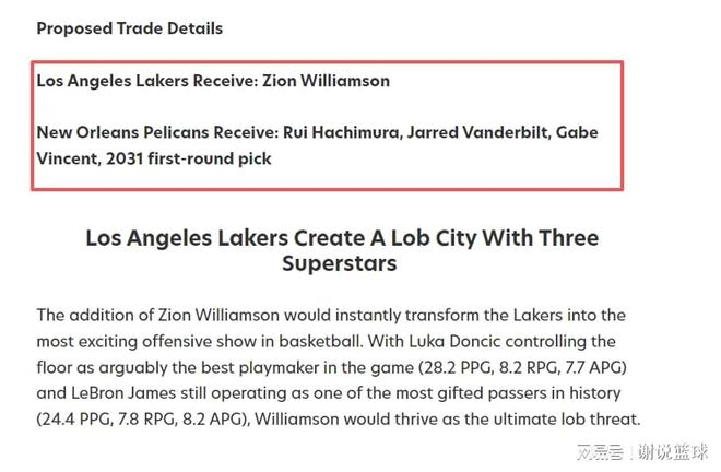 因为这是休赛期,因为联盟交通数字,湖人肯定会强调。毕竟,在此标签操作之后,即使湖人队的阵容已经改变,它可能不会升级,尤其是因为詹姆斯年龄较大,因此这个问题总是不可避免的。因此,媒体FW建议湖人可以考虑达成4比1的交易,并且从特定的计划中,湖人可以在威廉姆森的前锋泰(Tsai tsai)下购买。当然,由于未来的所有权透支,湖人队并没有捐出太少,包括三名球员Hachimura Hachimura,Vanderbilt,Vanderbilt,Vincent,Vincent和2031年的首轮选秀权。Zion Williamson拥有才华横溢的人才,当时没有悬念,甚至没有悬念,甚至考虑了未来联赛的面孔。但是锡安·威廉姆森(Zion Williamson)一直被困在受伤中。两年来,他刚刚打了60场比赛。在过去的24-25赛季中,锡安·威廉姆森(Zion Williamson)在报酬之前只打了30场比赛,这肯定是TE的重要损失是。当然,在健康的状态下,Tsian Williamson表现良好。上个赛季,他场均得到24.6分,7.2个篮板,5.3个帮助和1.3次抢劫,这是全明星级的。鹈鹕现在陷入困境,似乎重建了重建阶段。因此,将泰(Tsai)保持威廉姆森(Williamson)是没有意义的。湖人显然是不同的。一方面,锡安·威廉姆森(Zion Williamson)健康,可以提供强大的战斗力量。尤其是他对油漆区域的威胁是目前湖人球员当前都没有的主要因素。此外,锡安·威廉姆森(Zion Williamson)仅在7月庆祝了他的25岁生日,应该非常年轻,这与湖人的长期计划相符。在这个交易计划中,湖人支付的最重要的议价筹码应该是Hachimura Shizuo。作为首发第四位,他也可以牢固地表现,但毕竟,强烈的内gui和弱势防守也是湖人最好的议价筹码。受伤后,他的病情不是与过去不同,但他的出勤率很难描述。在介绍了智慧并改善了后场的整体深度之后,文森特的角色完全覆盖了他,因此无需保留它。 Tsai的鹈鹕威廉姆森(Williamson)的出售等同于过去几年重建的直接坦白,以完全失败而告终,但也被认为是预停机的损失。鹈鹕队获得的球员在合同的年份不足,不会影响他们的未来计划,请选拔选秀权。
